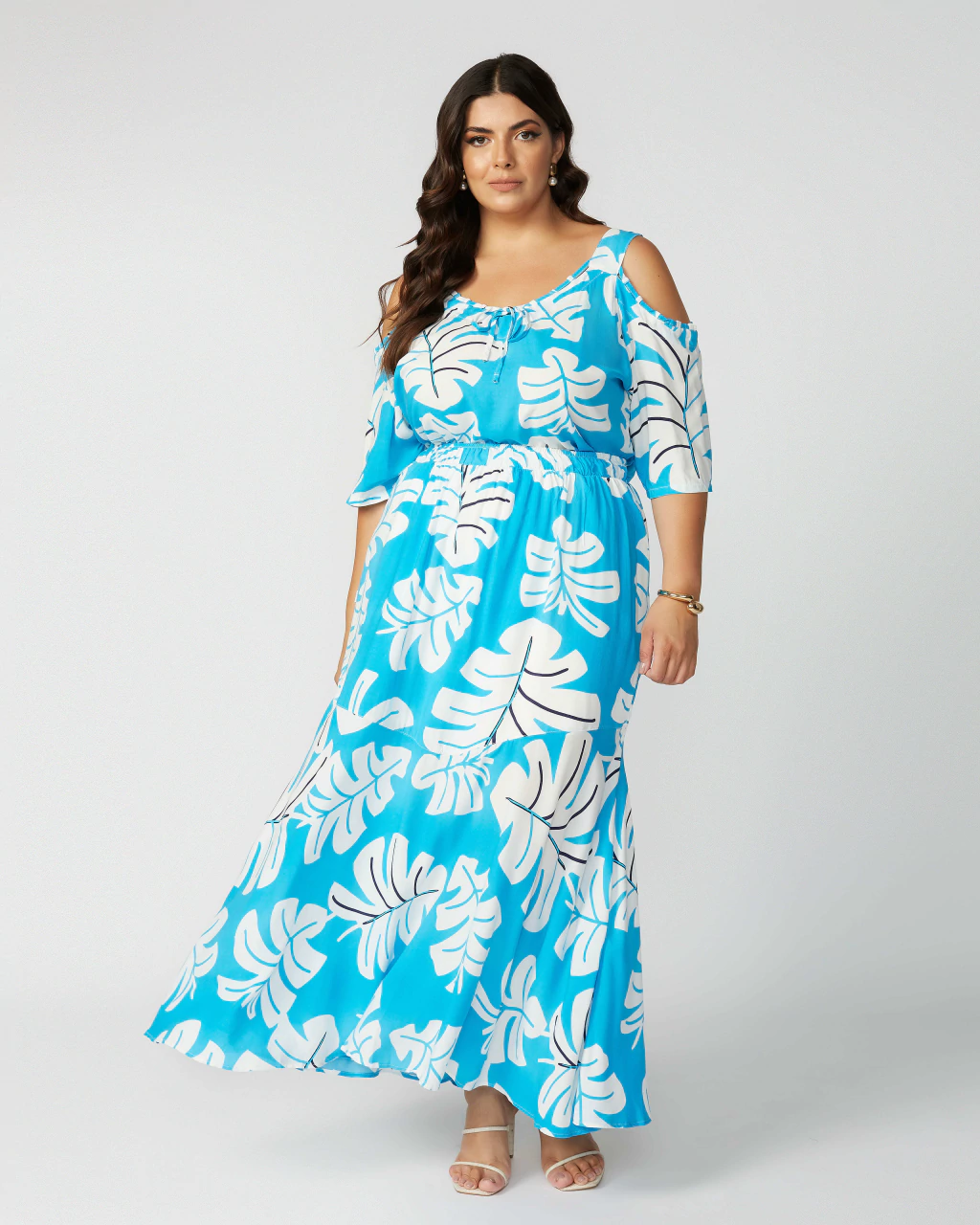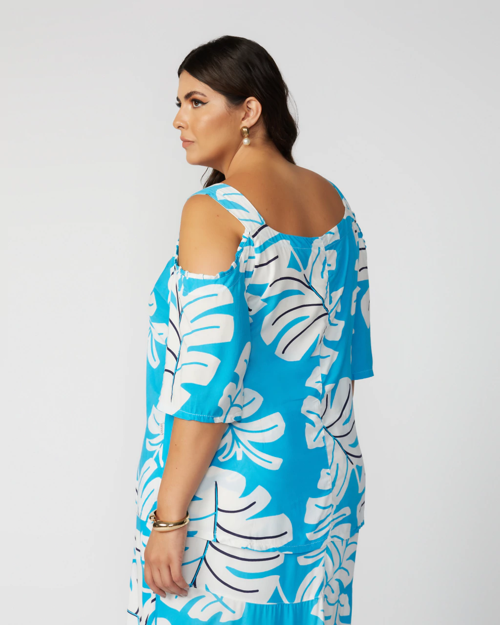 DESCRIÇÃO: Blusa em viscose, com manga 3/4 e abertura no ombro, gola redonda com detalhe de passador no ombro e busto e detalhe de cordão para amarrar no busto.