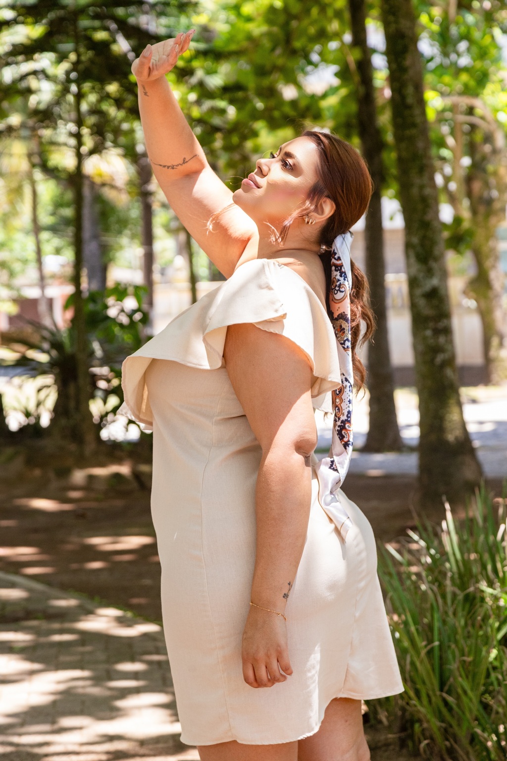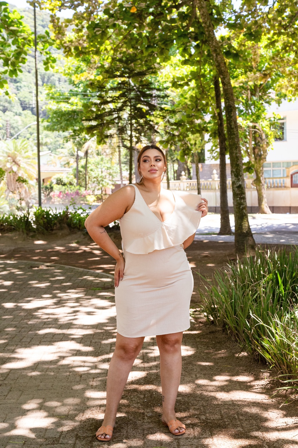 Vestido em viscolinho, com decote V, alça, detalhe de babado transpassado e zíper nas costas.